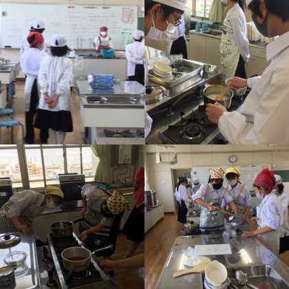 1年生は、家庭科の授業で、中学校に入って初めての調理実習がおこなわれました。献立は、「鯖トマトカレー」で、包丁をつかわず、アルファ米や鯖缶、トマトジユースをつかって、ライス、カレールーをつくっていました。