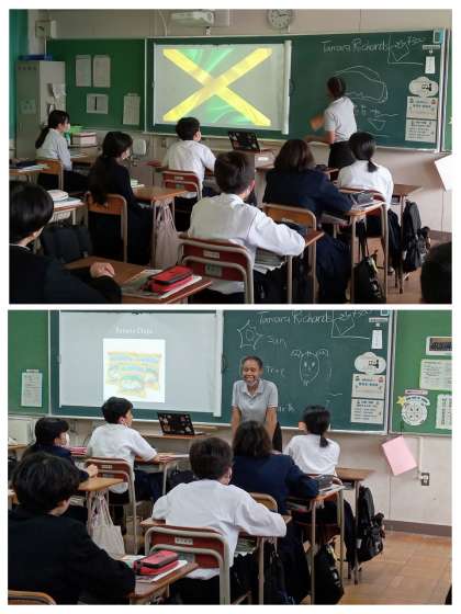 2年生の英語科はC−NETの授業でした。今日から新しく本校に来ていただいたC−NETで、自己紹介や母国ジャマイカについてのいろいろな紹介がありました。最後は、生徒からの英語での質問がありました。