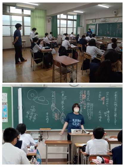 2年生の国語科の授業は「短歌十種」を学習しました。”シャボンまみれの猫が逃げだす午下がり永遠なんてどこにも無いさ”の短歌について、生徒一人ひとりが”誰が””どこで””どうしたのか”を考えました。共有する場では、様々な考えが出てきました。