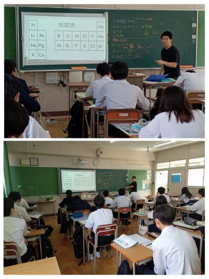 3年生の理科の授業は、電解質の特徴について学習しています。今日は電解質が水に溶け陽イオンと陰イオンに分かれる電解を式で表しました。イオンによって表し方が異なるので、苦戦している生徒もいました。