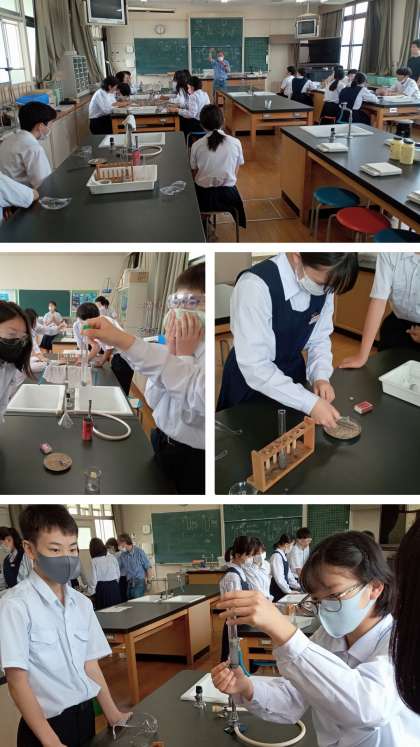 2年生の理科の授業は、理科室で”鉄とイオウが結びつくか”実験を行いました。鉄粉と硫黄の粉末を混ぜ合わせ、アルミニウムはくの筒につめバーナーで熱し観察をしました。実験中はにおいが発生するため、部屋の空気が十分に入れ替わるように注意しながらすすめました。