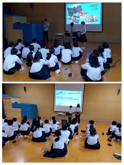 1年生は格技室で、来週15木〜16金に実施する”一泊移住”の取組みを行いました。当日の活動にあるレクリエーションは、生徒の実行委員会で考えました。今日はその実行委員会から、レクリエーションの内容の紹介・説明がありました。