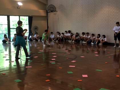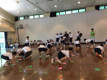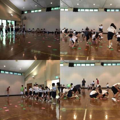 ?多目的ホールに集合して、スポーツ大会が始まります。まず、A vs Bダンボールスプラットゥーンです。クラス対抗で汗まみれになってカードを返しました。