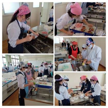 2年生の家庭科の授業は、調理実習を行いました。三角巾にエプロン姿で、”ハンバーガー”と”キュウリの酢の物”を作りました。地域の方々もたくさんお手伝いに来ていただいたおかげで、どの班も予定よりも早くできあがりました。