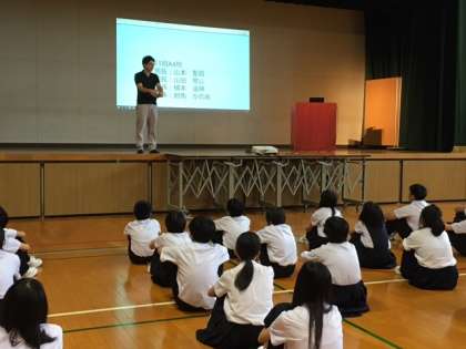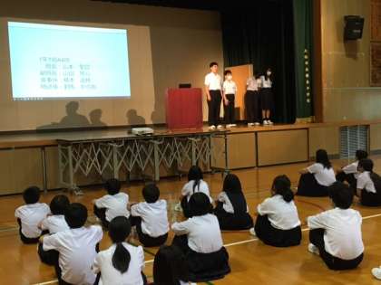 6時間目、1年生は体育館に集合し、一泊移住のスライド発表会がおこなわれました。