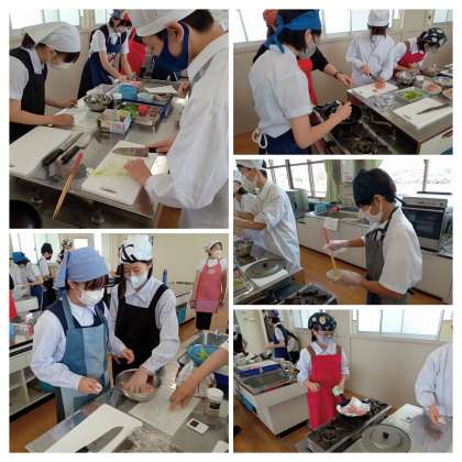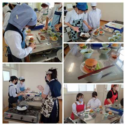 2年生は先週と別のクラスが、家庭科の授業で調理実習を行いました。メニューは同じ”ハンバーガー”と”キュウリの酢の物”を作りました。今日も、地域の方々にお手伝いに来ていただいたおかげで時間内にすべての班ともできあがり、とても美味しくいただきました。