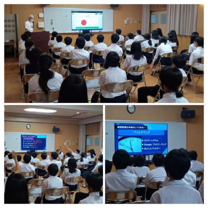 6限目、1年生は2年生に続いて情報モラル教育を実施しました。事前の1年生のアンケートの結果の説明の後、ゲームのやりすぎで”こんなことになっていないか”質問がありました。そして2年生同様、メッセージアプリでのトラブルなどの話がありました。