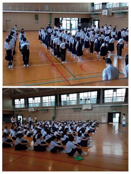 朝、体育館で生徒朝礼を行いました。校長先生から”挨拶”について話がありました。挨拶することで、他の人を気分良くさせることができるし、自分も気持ちよくなります。大きな声であいさつをすることを続けましょう。