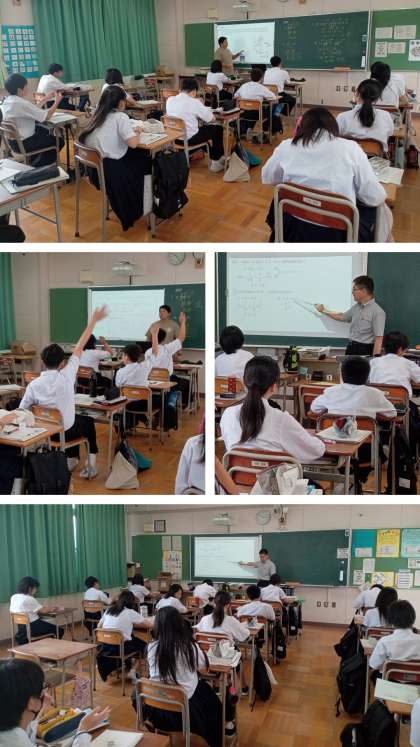 2限目の1年生の授業は、A組もB組の数学科の授業です。「式の値」「比例式」の学習をしていますが、しっかり考えないと誤りやすいので、生徒は丁寧に計算をしていました。