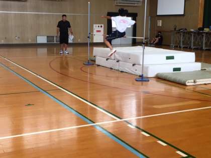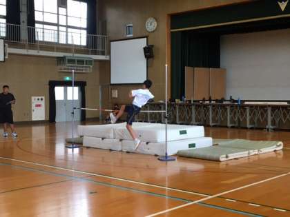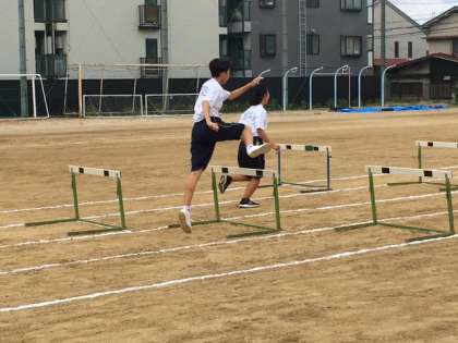 9月8日(金) 3時限目、2年生は体育の授業です。男子は、体育館で走り高跳び、女子はグランドでハードル走の練習です。ハードル間の歩数を考えながら、練習しています。