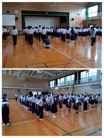 朝、体育館で生徒朝礼を行いました。先週末からラグビーワールドカップが始まりましたが、校長先生からラグビーにおける『ノーサイドの精神』についての話がありました。