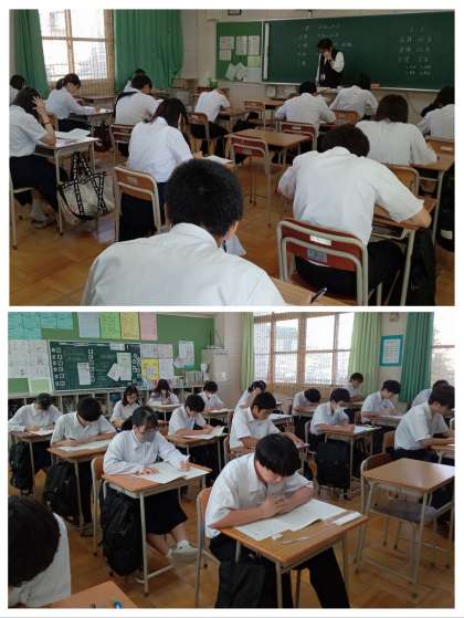 3年生は、1限から5限まで第2回実力テストを実施しました。「国語」「英語」「理科」「社会」「数学」の5教科のテストを行い、真剣な表情でテスト問題に取り組んでいました。これから3年生は進路に向けた大切な時期になってきます。自らの進路の目標を設定し、課題の克服に努めてください。