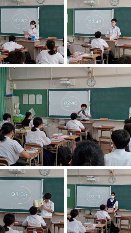 2年生の国語科の授業でのビブリオバトルでは、原稿も見ずにおすすめの本の魅力を紹介する生徒や、身振り手振りを交えユーモアたっぷりに紹介する生徒など、どの本も読みたくなる紹介でした。