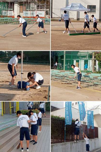 昨夜に降った雨のためグラウンド状態が悪くなったので、放課後、フェスタ委員と体育委員でグラウンドの整備を行いました。明日のスポーツの部は、天気予報では雨の心配もなく絶好のコンディションで実施できるでしょう。