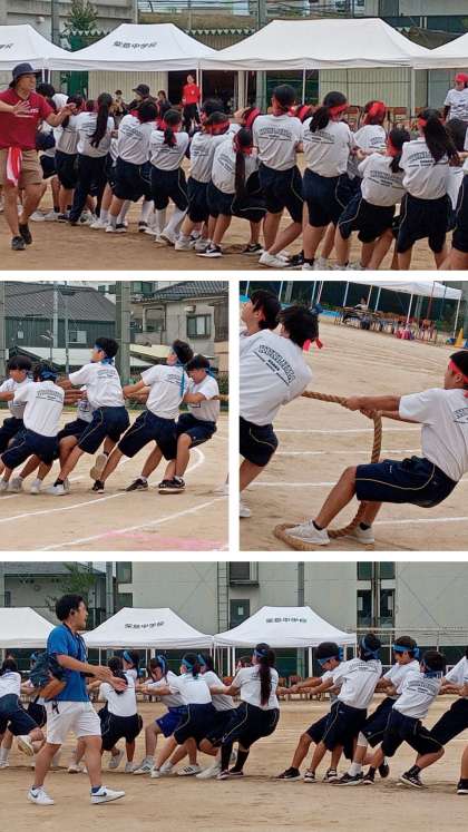 団対抗全員綱引き、力を合わせて綱を引く手や足に力が入っています。結果は2本とも赤団の勝利でした。