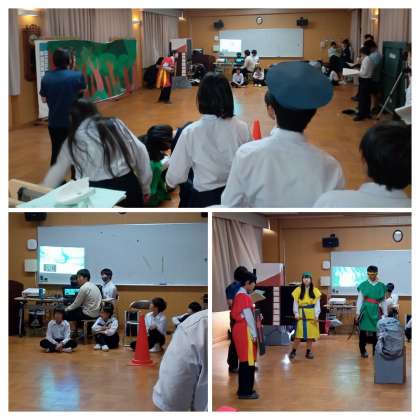 1年と2年は、学年での劇を予定しています。1年生は多目的室で、衣装を着けての練習をしていました。2年生は美術室に集まって、練習をした映像を全員でチェックをしていました。