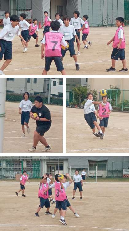 1年男子の体育科の授業はハンドボールを行っています。パス練習、パスからシュート練習の後、担任の先生も参加してゲームを行いました。