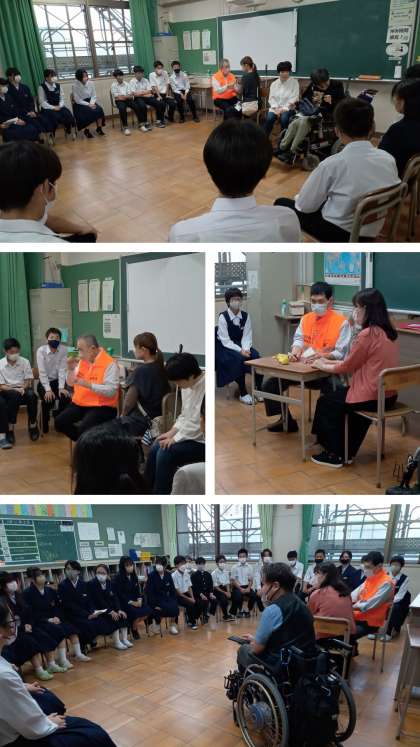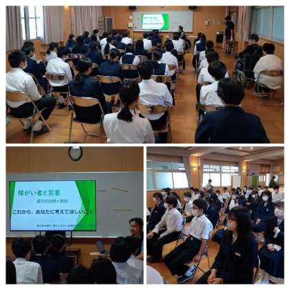 5,6限、2年生は「ゆめ風プロジェクト」の取り組みを行いました。障がいについて理解を深める取り組みとして、障がいのある方にお話を聞きました。5限は学年全員が多目的室で、”障がい者と災害”について講話をしていただきました。6眼はクラスに分かれて、盲ろう者の方のお話を聞きました。生徒たちは講話もお話も興味深く、真剣に聞き入ってました。