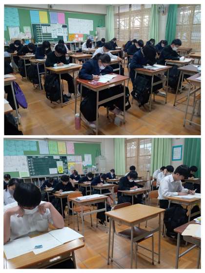 3年生は、朝から「第4回実力テスト」を実施しました。今日一日、1限目の”数学”から”英語””国語””理科””社会”の5教科のテストに挑みます。教室は問題に集中する中、解答を書くシャープペンの音だけが聞こえてきました。この実力テストは進路選択をするため大切な資料となります。今の自分の学習理解度を知り、今後の入試対策につなげてほしいと思います。そして、それぞれの希望する進路に向けて、今後のさらなる努力を期待します。