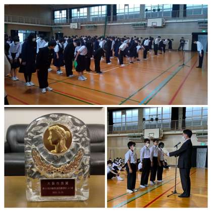 朝、体育館で行った生徒朝礼で、校長先生から生徒会役員と学級委員に認証状が渡され、前生徒会長拶と新生徒会長から挨拶がありました。また、大阪府発明くふう展において”大阪市長賞”を受賞した生徒と、大阪市ロボットコンテストで”奨励賞”を受けた技術部に賞状が渡されました。