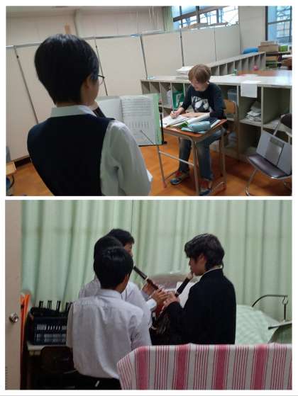 2年生の音楽の授業は、アルトリコーダーのテストを実施しました。一人一人が順に別室で”ふるさと”をリコーダーで演奏します。音楽室では、これからテストを受ける生徒が個々に練習をしていました。