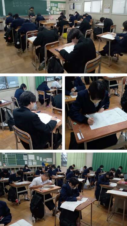 今日から祝日を挟んで3日間、2学期の期末テストを実施しています。朝の登校時も、ファイルやプリントなどを持ち登校してくる生徒の姿をたくさん見ました(嬉しいことですが、歩きながらは控えてほしいですね)。1日目の今日は、1・2年生は”国語”と”社会”の2教科のテストが、3年生は”美術”を加えた3教科のテストが実施されます。