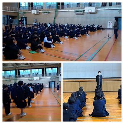 朝、体育館で生徒朝礼を行いました。今日12月4日(月)から10日(日)までの1週間を「人権週間」と定めれれています。校長先生から、”人権”について考えるきっかけとなるよう「全国中学生人権作文コンテスト」の入賞作文が紹介されました。
