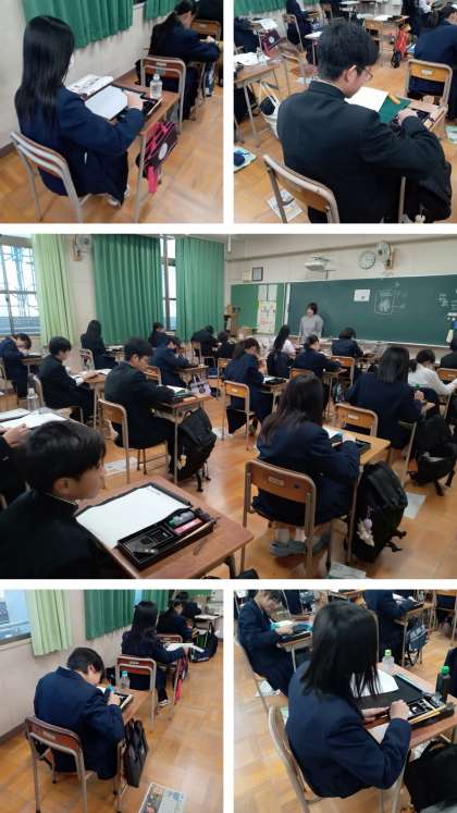 1年生の国語科の授業は「書道」を行っています。今日が初めての書道の授業で、まずは墨をするところからはじめていました。摺れたがどうか試しに配られた半紙に書いてみて、思ったほど濃く・黒くできていなく、何度も摺りなおしていました。