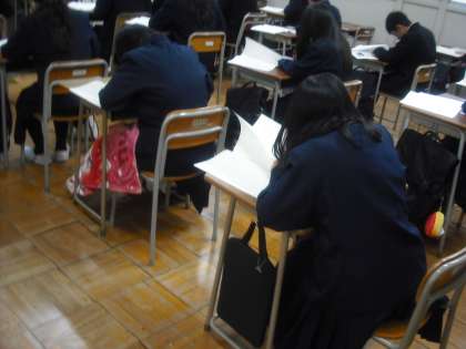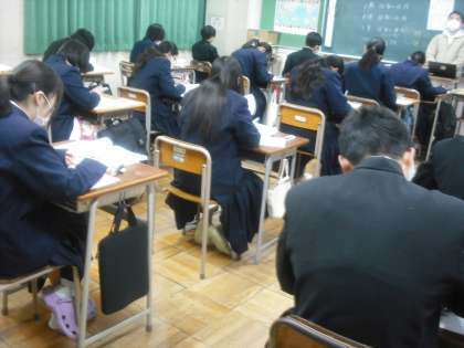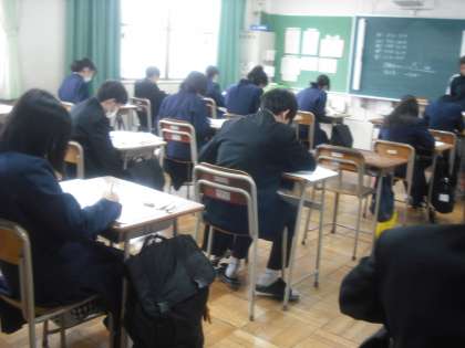 2年生は、1限から「国語」「社会」「数学」「理科」「英語」の順に、5教科のチャレンジテストに挑みました。このテストは1年同様、生徒たちが自分の学習到達状況を正しく知ることにより、学習目標や学力向上への意欲を高めるためのものです。生徒たちは、問題に一生懸命取り組んでいました。