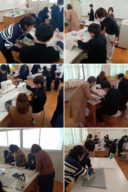 1年生の家庭科の授業は、リネンハンドメイドキットを使って作品を作っています。”ミニバック””シューズ袋””ティッシュカバー””ランチョンマット”から、自分の作りたいものを作りました。地域の方にもお手伝いをいただき、ミシンがけやアイロンがけなどサポートしていただきました。