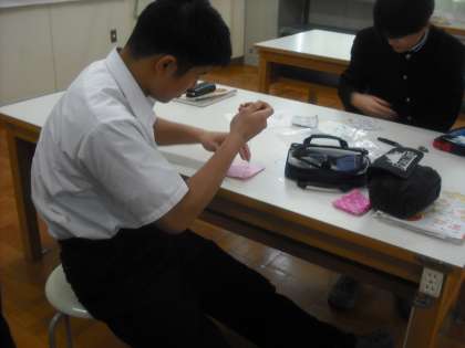 3時限目、3年生は家庭科の授業です。被服室で、「お手玉玉の製作」です。地域の方にサポートで参加していただき、生徒たちは、ひと針ひと針、丁寧に縫っていました。