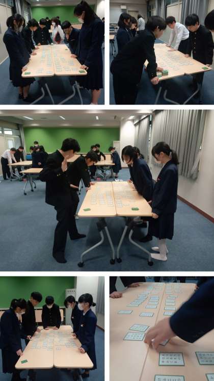 2年生の国語科の授業では”小倉百人一首”を学習しています。今日はLL教室で、4〜5人ずつの4つのグループに分かれて個人戦で競技をしました。上の句が読まれるとすぐに札を探し出す人、いくつかの札に狙いを絞っている人、先生を相棒にして札を取る人など、どのグループも白熱していました。