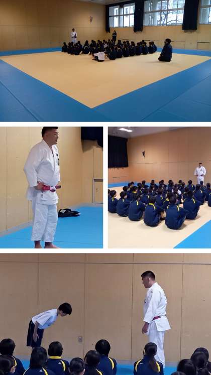 2年生の体育科の授業は「柔道」を行っています。畳が敷き詰められた格技室で、今日が最初の授業です。礼の意味・方法、立ち方・座り方など、”柔道とは”のオリエンテーションがありました。これからの授業で、まずは受け身から学ぶ予定です。