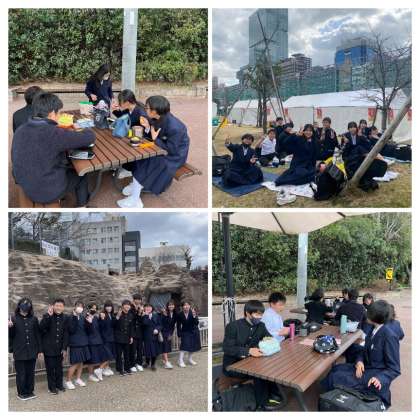 昼まで、自由散策と昼食です。天気もいいので”てんしば”の芝生の上で弁当を食べているグループがあります。