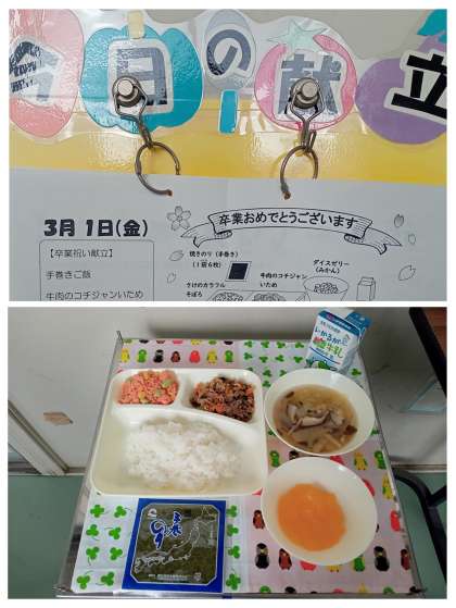 卒業式まであと2週間を切りました。今日の給食は少し早いですが「卒業祝い献立」で、”手巻きご飯(牛肉のコチジャンいため、さけのカラフルそぼろ)””すまし汁””ダイスゼリー””牛乳”です。