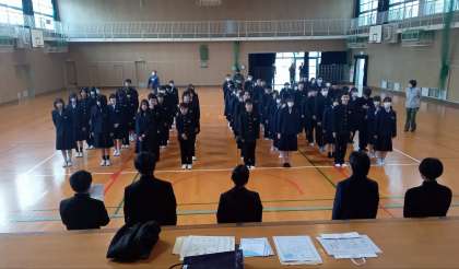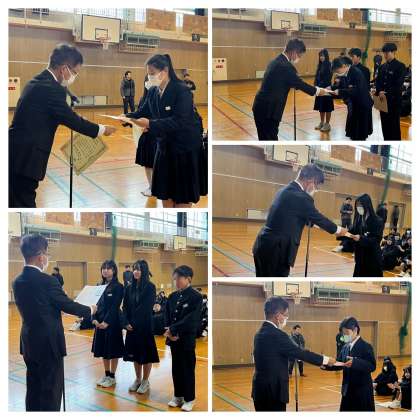 朝、体育館で生徒朝礼を行いましたが、3年生が卒業して1・2年生だけの生徒朝礼となり寂しく感じます。”愛鳥週間用ポスター原画コンクール(大阪府知事賞)””明るい選挙ポスターコンクール””大阪市明るくきれいな選挙推進コンクール””書写 書初め(優秀)””東淀川区中学生食パンデコグランプリ(グランプリ)””いのちのつながり作文”と、いろいろな場面で活躍をした生徒への賞状伝達がありました。校長先生からは、来年の卒業式は今年以上に素晴らしい式になるよう、頑張りを日々積み重ねてほしい、と話がありました。