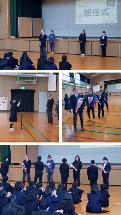 修了式の後、この3月末をもって柴島中学校を去られる先生の「離任式」を実施しました。お一人ずつ挨拶をいただき、代表生徒から”お礼のことば”がありました。生徒会役員から花束が渡され、花道を作って送り出しをしました。