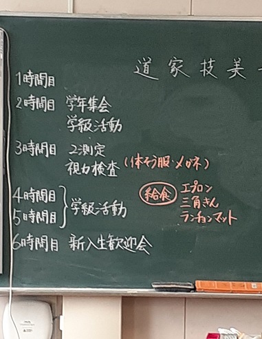 今日は、朝の朝礼指導を皮切りに、学年集会・2測定(身長と体重)・視力検査・校内見学(1年生)・学級役員および教科係の選出・学級活動・新入生歓迎会を行いました。