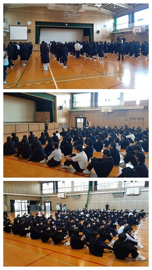 まずは、朝の登校後、昨日に引き続き、体育館で朝礼指導を行いました。