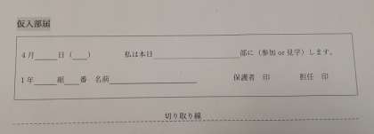なお、見学・体験の参加には、日々、保護者の方に「仮入部届」を記載・押印していただく必要があります。お手数ですが、よろしくお願いいたします。