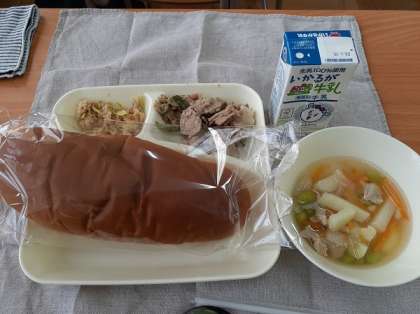 豚肉のガーリック焼きは、薄切りの豚肉をガーリック・塩・こしょう・しょう油などで下味を付けた後、焼き上げていました。スープは、鶏肉・ジャガイモ・玉ねぎ・人参・枝豆が入っており、具だくさんのチキンブイヨンスープでした。