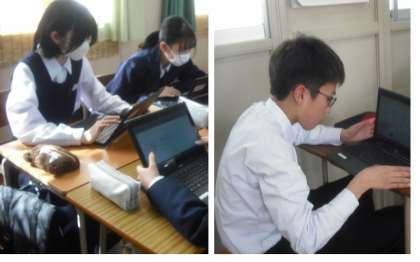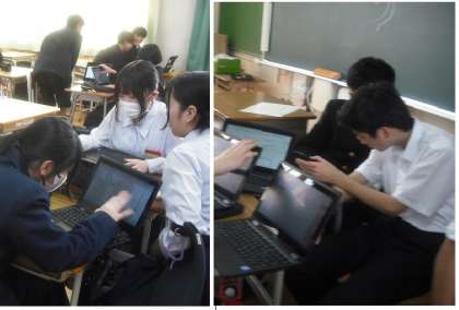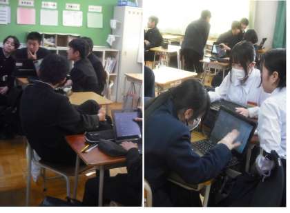 各班に分かれて、岡山美観地区での行程を相談していました。学習者用端末のフル活用です。インターネットから多くの貴重な情報を集めて、活発に意見交換していました。