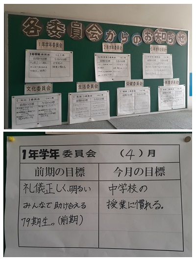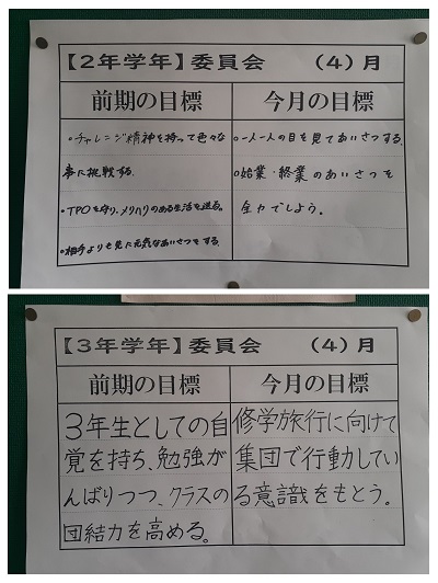 昨日の委員会活動時に話し合って決めた、「前期の目標」と「今月の目標」が掲示板に張り出されていました。