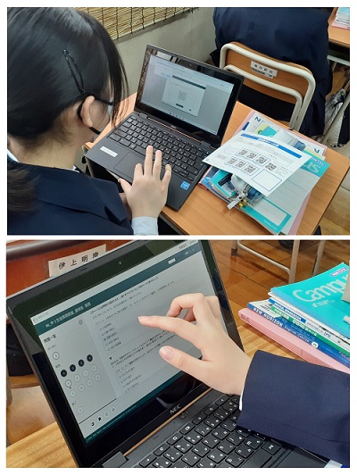 自席で端末を立ち上げた後、インターネットで文部科学省のWebシステムのサイトに接続し、生徒一人ひとりに割り当てられた2次元コードを読み取らせ、質問調査にログインです。