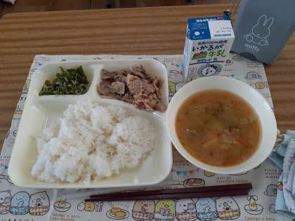 豚肉のしょうが焼きは、薄切りの豚肉にしょうが汁、しょうゆ、料理酒、みりん、砂糖で下味を付け、焼き上げていました。「ザ・おかず」の代名詞がふさわしく、子どもたちもごはんが進みました。