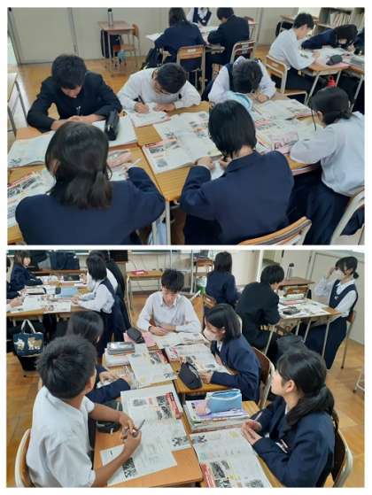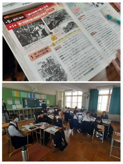 歴史の学習で、第一次世界大戦の特徴について詳しく学習が進められていました。先生からの説明を聞き、教科書、ワークシートを活用しての班での協働学習です。