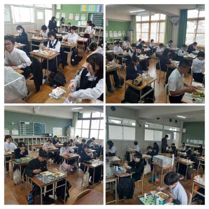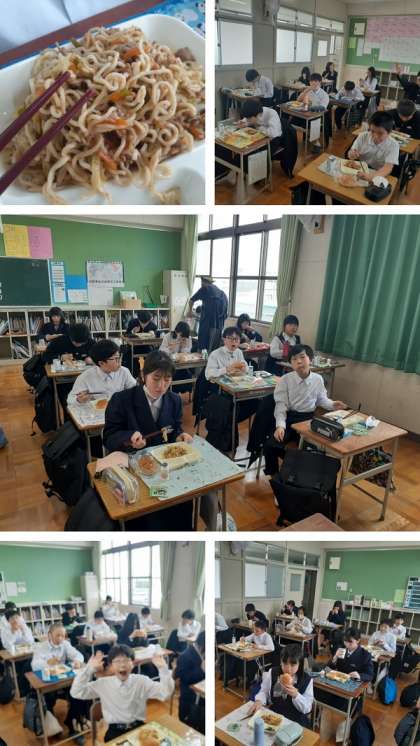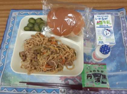 今日は、焼きそばがメインのため、パンはミニサイズとなっています。パンに切り込みや穴をあけ、焼きそばを挟み込んで「焼きそばパン」にしている生徒もチラホラいました。