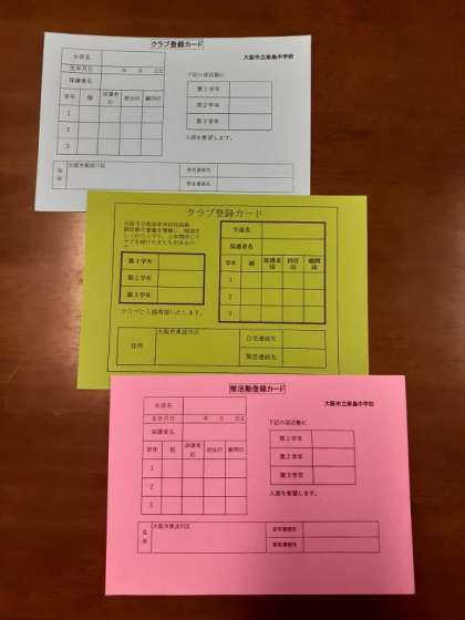 部活動登録証に必要事項を記入して、明日、忘れないように持ってきてください。保護者の方の確認も必要です。
