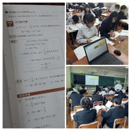 まず、式を計算し、簡単にしてから、数値を代入し計算して答えを求めます。生徒たちは、例題を解いたのち、たくさんの問題で練習していました。