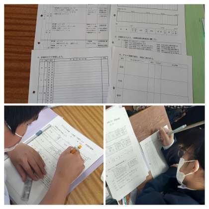 1年生にとっては中学生になっての初めてのテストです。6時限目には、各教科のテスト範囲が記されたテスト計画表がファイルとともに配付され、目標の設定、テストに向けての日々の学習計画を立てました。